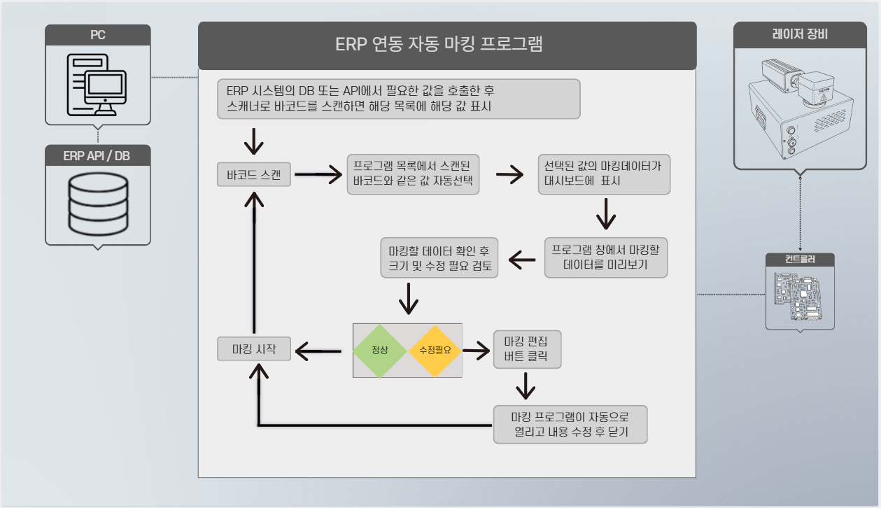 막스레이저는 ERP(Enterprise Resource Planning) 시스템과 연동된 자동 마킹 솔루션을 제공하여, ERP 데이터 기반으로 마킹을 자동화하고, 모든 작업 이력을 안정적으로 관리할 수 있도록 지원합니다.